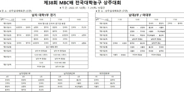 한국대학농구연맹은 지난 17일 제38회 MBC배 전국대학농구 상주대회의 조 편성과 대진표를 확정, 공개했다.