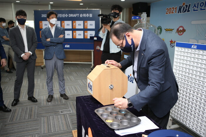 2021 KBL 국내신인선수 드래프트를 위한 순위 추첨식이 8일 오후 KBL센터에서 열렸다.