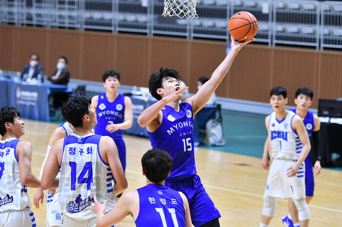 명지대학교(이하 명지대)는 6일 서수원칠보체육관에서 열린 2021 KUSF 대학농구 U-리그 3차 대회 남대부 B조 예선에서 조선대학교(이하 조선대)를 111-66으로 제압했다. 3차 대회 첫 승을 신고했다.