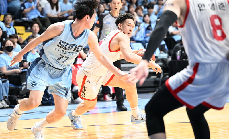 최승욱은 2025~2026 6강 플레이오프에서 중책을 맡았다. SK 볼 핸들러이자 주요 외곽 득점원인 김낙현(184cm, G)과 마주한 것. 김낙현의 장기가 ‘낮은 드리블’과 ‘풀업 점퍼’이기에, 최승욱은 여러 가지를 신경 써야 했다.