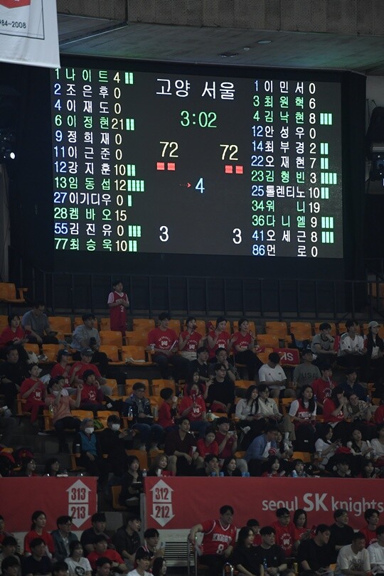 전희철 SK 감독이 마지막 타임 아웃을 사용했다. SK는 이정현을 더 강하게 막았다. 그렇지만 스크린 이후 림으로 향하는 나이트를 막지 못했다. 나이트에게 레이업을 내줬다. 그리고 다니엘이 경기 종료 30.7초 전 턴오버. SK는 72-76으로 밀렸다. 경기 시작 후 가장 큰 위기와 마주했다.