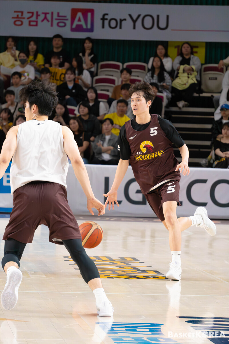 지난 18일 플레이오프 대비 자체 연습경기가 끝난 뒤 만난 양준석은 “소노랑 SK 경기가 치열했던 것 같다. 지켜보는 입장에서 좀 더 마음을 단단하게 먹어야겠다고 생각해 (플레이오프를) 준비하는 자세도 되새긴 것 같다. 누가 올라오든 우리만의 색깔을 맞춰 준비했는데, 상대가 소노로 정해졌으니, 거기에 잘 맞춰서 준비할 생각이다”라며 소노와 SK의 6강 플레이오프를 지켜본 소감부터 전했다.