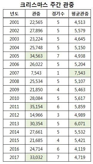 | 2001년 이후 12월 24일과 25일 동시에 경기가 열렸을 때 평균 관중 비교 |