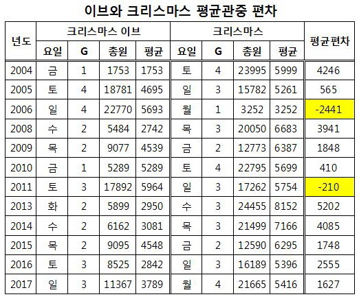 | 2001년 이후 크리스마스 이브와 크리스마스 합계 관중 비교 |