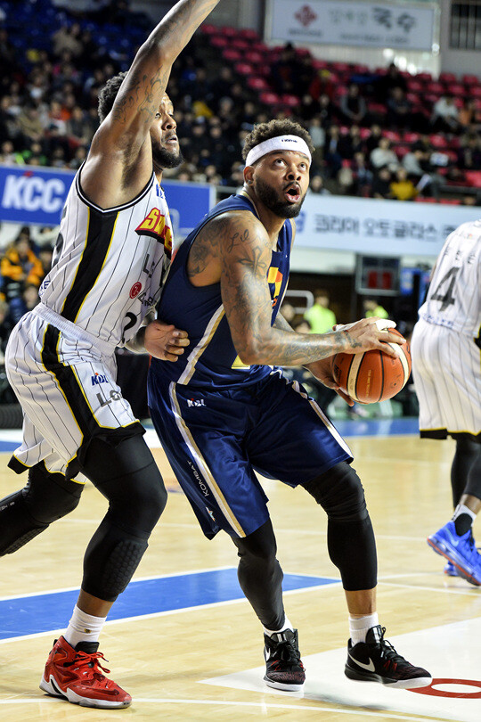 [바스켓코리아 = 전주/이재범 기자] 찰스 로드와 제임스 켈리가 득점 경쟁을 펼쳤다. 동료들의 도움을 받은 로드가 활짝 웃었다.