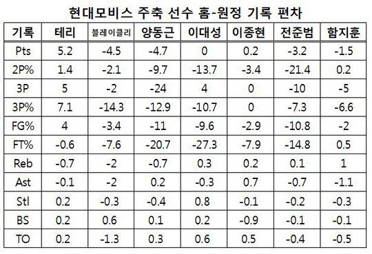 주축 선수 6명(양동근, 이종현, 전준범, 함지훈, 테리, 블레이클리)의 홈과 원정 기록을 살펴보면 이대성과 함지훈은 득점에서 큰 차이가 없다. 양동근(8.3-13.0=-4.7점)과 블레이클리(12.4-16.9=-4.5점)가 득점 편차가 크다. 전준범(7.2-10.4=-3.7점)도 그 못지 않다. 특히 양동근(73.7%-94.4%=-20.7%)과 이대성(72.7%-100%=-27.3%)은 자유투 성공률 편차가 너무나도 심하다.
