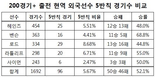 장수 외국선수 5명, 5반칙 퇴장 시 승률은?