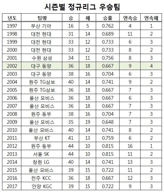 지금까지 시즌 중에 4연패를 당하고도 정규리그에서 우승한 팀은 2001~2002시즌 대구 동양(현 고양 오리온)뿐이다. 동양 역시 4연패를 4연패라고 보기 힘들다.