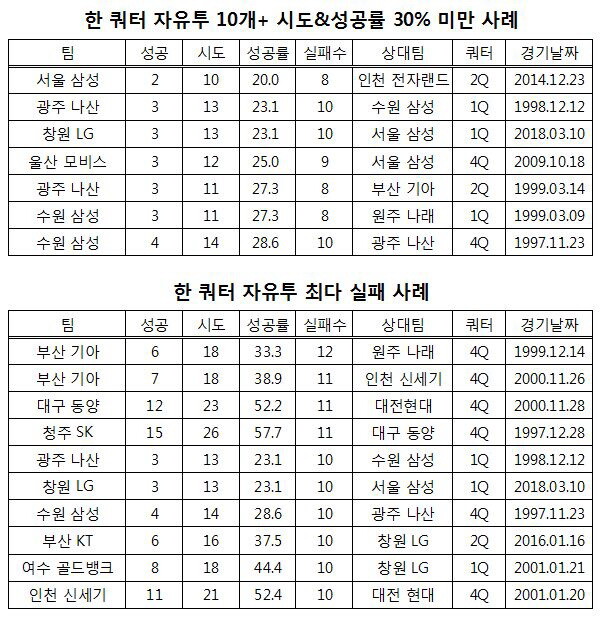 지금까지 한 쿼터에 자유투를 가장 많이 실패한 건 1999년 12월 14일 부산 기아가 원주 나래와 경기에서 기록한 12개다. 당시 기아는 4쿼터에 18개 자유투 중 6개만 성공했다. 11개의 자유투를 놓친 경우도 3차례 있었다.
