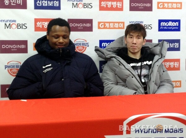 | 지난 3월 6일 울산 현대모비스에게 승리한 뒤 기자회견장에 함께 들어온 두경민과 디온테 버튼(사진 오른쪽) |