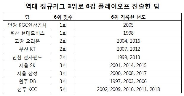참고로 전자랜드는 10개 구단 중 6위를 7회로 가장 많이 기록한 팀이다. KCC와 전자랜드의 맞대결은 3위와 6위를 가장 많이 경험한 두 팀의 승부다.