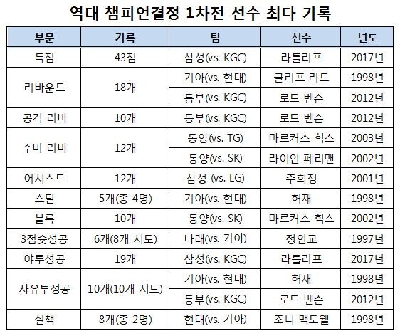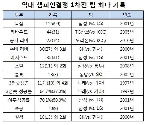 1차전 팀 최다 점수는 2000~2001시즌 삼성이 LG를 상대로 기록한 115점이다. 삼성은 이 때 LG에게 99점만 내주며 16점 차일 이겼다. 이는 1차전 최다 점수 차이 승리다.