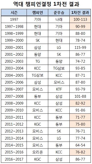 챔피언결정 1차전 승리팀의 챔피언 등극 확률은 잘 알려져 있다시피 71.4%(15/21)다. 1차전은 상위팀의 홈에서 열린다. 홈팀 승률은 11승 10패로 52.4%다. 홈팀과 원정팀의 평균 득점은 84.4점과 82.3점이다.