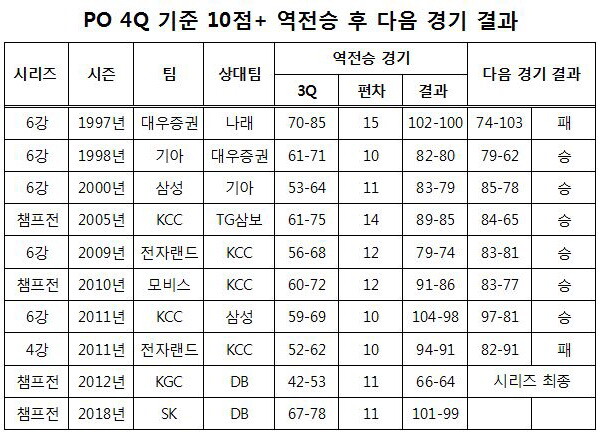 1997시즌 6강 플레이오프부터 이번 시즌 챔피언결정 3차전까지 플레이오프 총 경기수는 446경기. 이 중 4쿼터 시작할 때 10점+ 앞선 건 174경기이며 승부가 뒤집어진 경기는 10번이다. 5.75%로 최근 정규리그보단 조금 더 높은 확률이다.