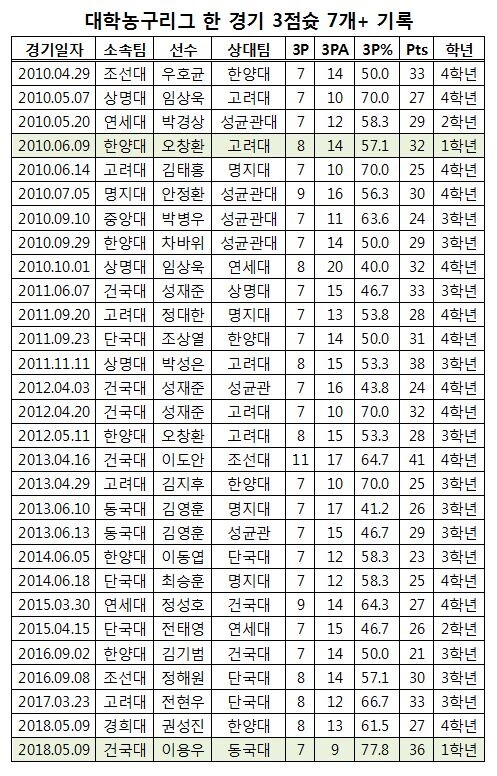 2010년 출범한 대학농구리그에서 1학년이 3점슛 7개 이상 성공한 건 2010년 6월 9일 한양대 신입생이었던 오창환(KT)이 고려대와 맞대결에서 8개를 성공한 이후 두 번째 기록이다.