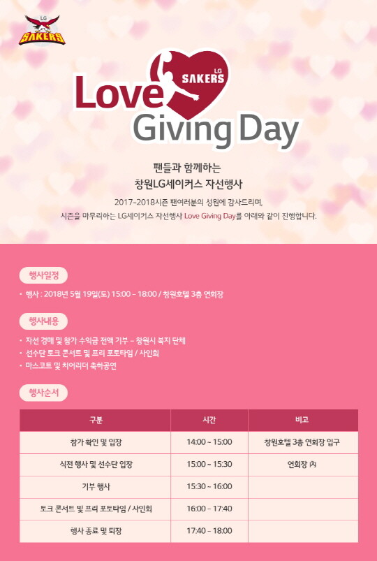 [바스켓코리아 = 김우석 기자] 창원LG세이커스(단장:한상욱)가 오는 5월19일(토) 창원에서 팬 사은행사 ‘러브 기빙 데이(Love Giving Day)’를 개최한다.
