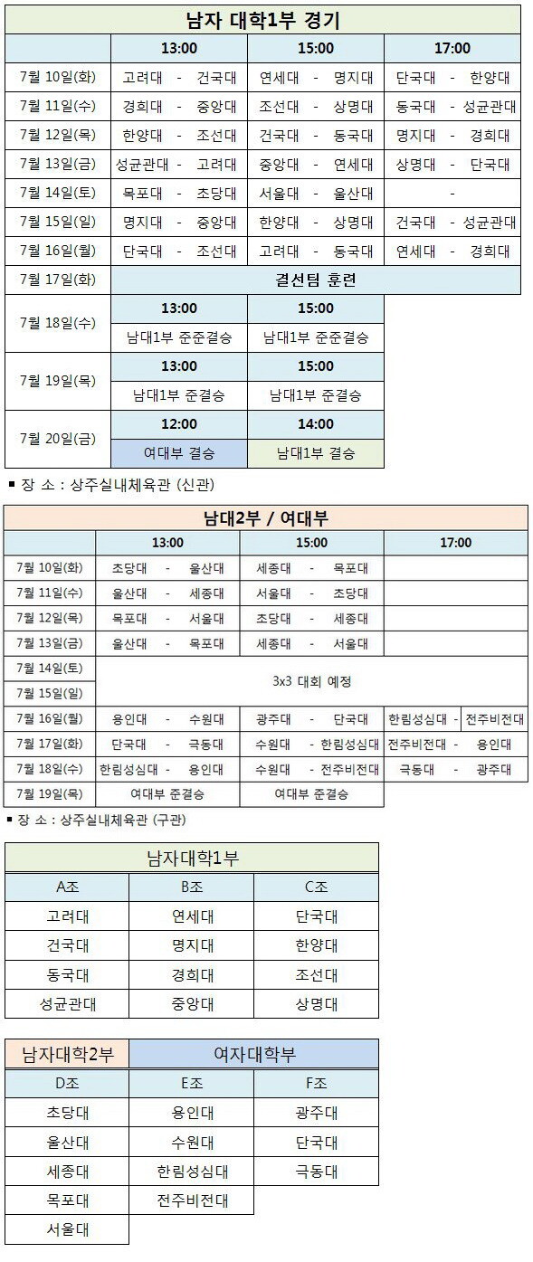 남자 2부 대학에선 초당대, 울산대, 세종대, 목포대, 서울대 등 5팀이 참가해 우승을 놓고 다툰다.