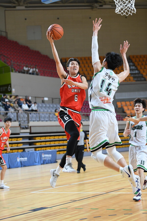 | 후반에만 코트에 나서 선배들의 득점을 돕고, 수비와 리바운드 등 궂은일로 승리에 힘을 실은 고려대 1학년 이우석 |